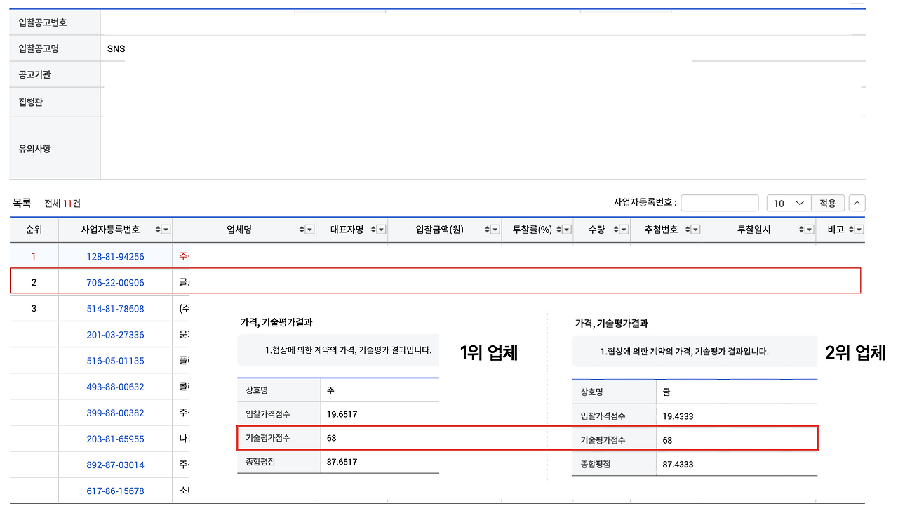 2024년에 참여한 SNS과업이었고, 기술평가점수는 68점으로 1위 업체와 동점이 나왔지만 1위 업체 가격 점수 19.6517점, 우리 업체(2위) 가격 점수 19.4333점으로 0.2184점 차이로 60,000,000원 프로젝트를 실주했습니다.