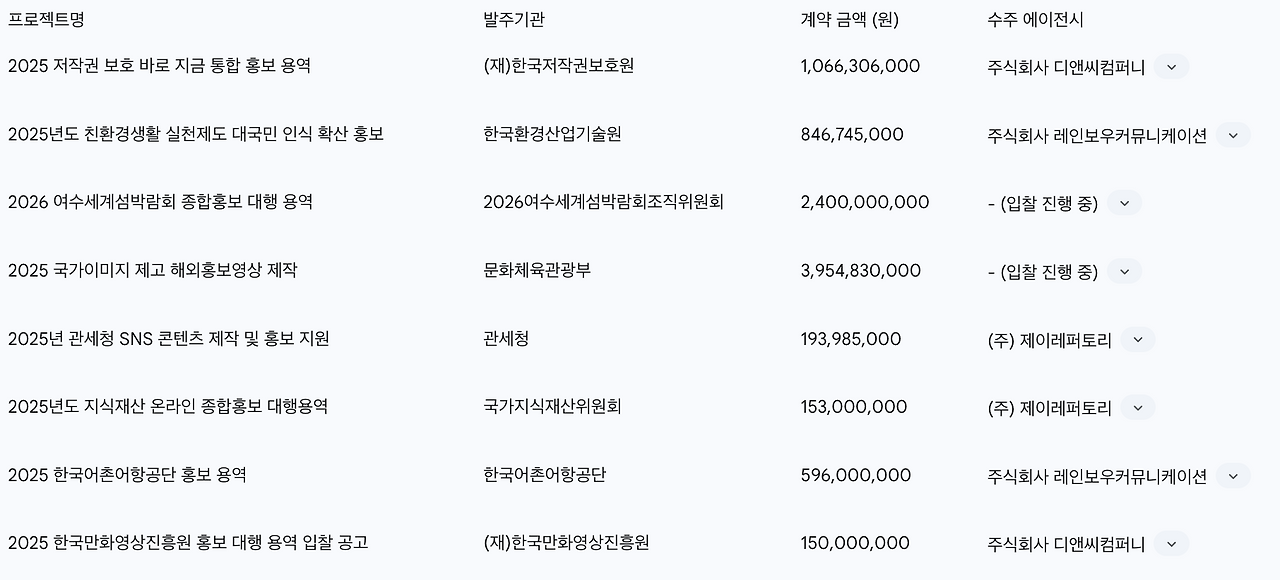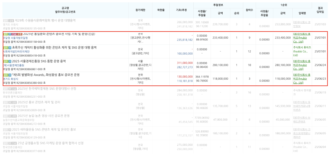 단일 건 1.5억 원 이하 공공입찰 홍보 시장은 경쟁이 치열하지만, 몇몇 기존 에이전시들이 시장을 장악하는 현상이 두드러집니다.