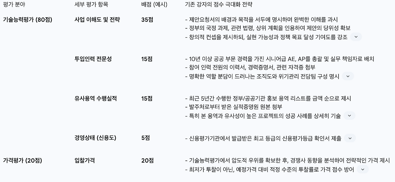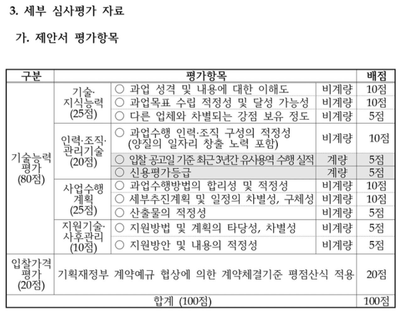 공공 부문의 제안서는 창의적인 아이디어를 담은 문서이기 이전에, 포괄적인 행정 및 기술 설계도에 가깝습니다. 제안서 평가는 제안요청서(RFP)에 명시된 엄격한 평가 기준표에 따라 진행됩니다. 일반적인 평가 항목은 다음과 같습니다.